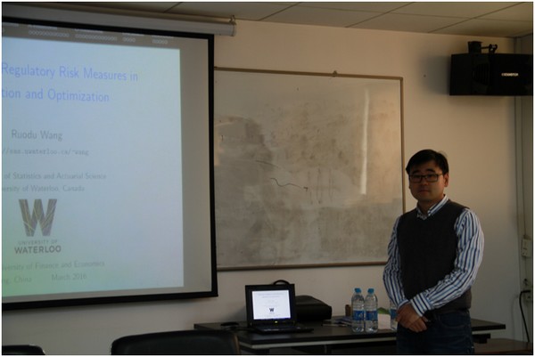 2016年3月31日上午10点整,中国精算研究院精算论坛讲座第七十八期准时开始。此次讲座的主讲人为来自加拿大滑铁卢大学的王若度教授,演讲题目为“ Robustness of regulatory risk measures in aggregation and optimization ”。中国精算研究院的周明副经理、池义春研究员等多位老师参加了讲座,并且与主讲人进行了充分热烈的讨论和交流。