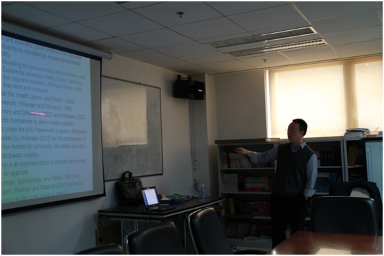 在整个报告过程中,Boda Kang教授一直与老师和同学有很好的交流,就建模方法以及统计分析手段等方面进行了深入地探讨。参加此次讲座的有来自公司的池义春、伍慧玲、刘芳达,金融公司的陈锐以及统计与数学公司的杨凤红、梁超等老师和同学。Boda Kang教授这次关于原油期货市场波动率结构的报告,不但让我们了解了原油期货市场不同于普通证券市场的特征,而且通过实证分析也向我们展示了不同的数值算法和统计方法如何应用到实际问题中。