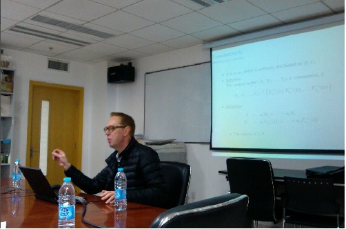 2014年11月7号上午,应公司风险量化与决策研究中心的邀请,国际著名的精算学家Jan Dhaene 教授在中国精算研究院会议室为师生们带来了题为“Index option: a model-free approach”和“Option prices and model-free measurement of implied herd behavior in stock markets”的精彩学术讲座。公司的杨再贵教授、周明研究员、郑苏晋副教授、韦晓副教授、董洪斌副研究员、伍慧玲副研究员和池义春副研究员等老师和部分研究生出席了此次报告。