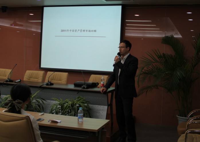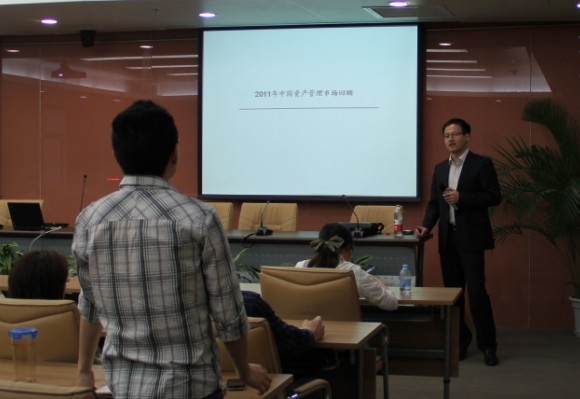 讲座开始前,许欣先生询问了在座的同学对资产管理的理解,针对一些同学存在着仅仅因为憧憬基金,券商等行业表面的高收入,从而想投身这些行业的想法给予了忠告,他认为金融行业并非所有的职位都是高收入,在没有兴趣支持的情况下,即使进入所谓的好行业也难有好的发展。这次讲座,许欣先生重点针对目前市场开展资产管理业务主体进行了比较分析。首先是基金行业,许先生通过统计数据阐述了我国基金的发展趋势,即自07年达到发展的高峰之后,基金总量处于持续下降的趋势;基金的数量在不断增大但是单只基金的规模却很小;2011年整个基金市场除了货币型基金盈利,其余类型基金都处于亏损状态。尽管基金行业存在不少问题,但许欣先生认为基金依然是潜力巨大的朝阳行业。然后,许欣先生对目前资产管理业务的市场份额比较低的券商开展资产管理业务的优势做了重点阐述,他认为券商有基金公司无法比拟的内部资源整合能力强、营业网点广泛的优势,未来的增长空间非常巨大。接着,许欣先生又对银行理财业务进行了点评,他认为国内目前的银行理财产品大多数是短线的产品,而且资产池不透明,不利于监管和资产匹配管理,隐含着很大的风险。随着银监会对于银行理财产品越严格的监管,国内的理财产品在数量上会有所减少。最后,许欣先生对信托和保险公司的资产管理公司的现状给出了自己的看法。他认为,中国的信托目前的优势是其包含其他金融机构在各自监管制度下无法涉及的领域,这种优势会随着监管制度的完善而逐渐消失,因而国内的信托业积极进行各种创新,从房地产信托到矿业信托等,信托是最活跃的行业。对于保险公司的资产管理公司,许欣先生认为,其在未来将面临基金公司在内的第三方资产管理公司的竞争,而保险背景的投资型人才也会越来越受到欢迎。