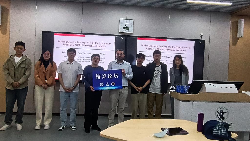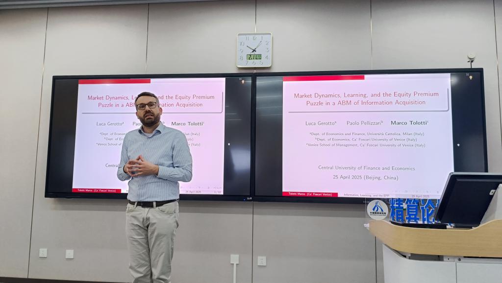 2025年4月25日上午,中国精算研究院在沙河二教215教室成功举办了第259期精算论坛。本次论坛有幸邀请到了意大利威尼斯卡福斯卡里大学威尼斯商公司的Marco Tolotti教授,他为与会师生带来了一场题为“Market Dynamics, Learning, and the Equity Premium Puzzle in an Agent-Based Model of Information Acquisition”的精彩学术报告。本次讲座由中国精算研究院的郑敏教授主持。