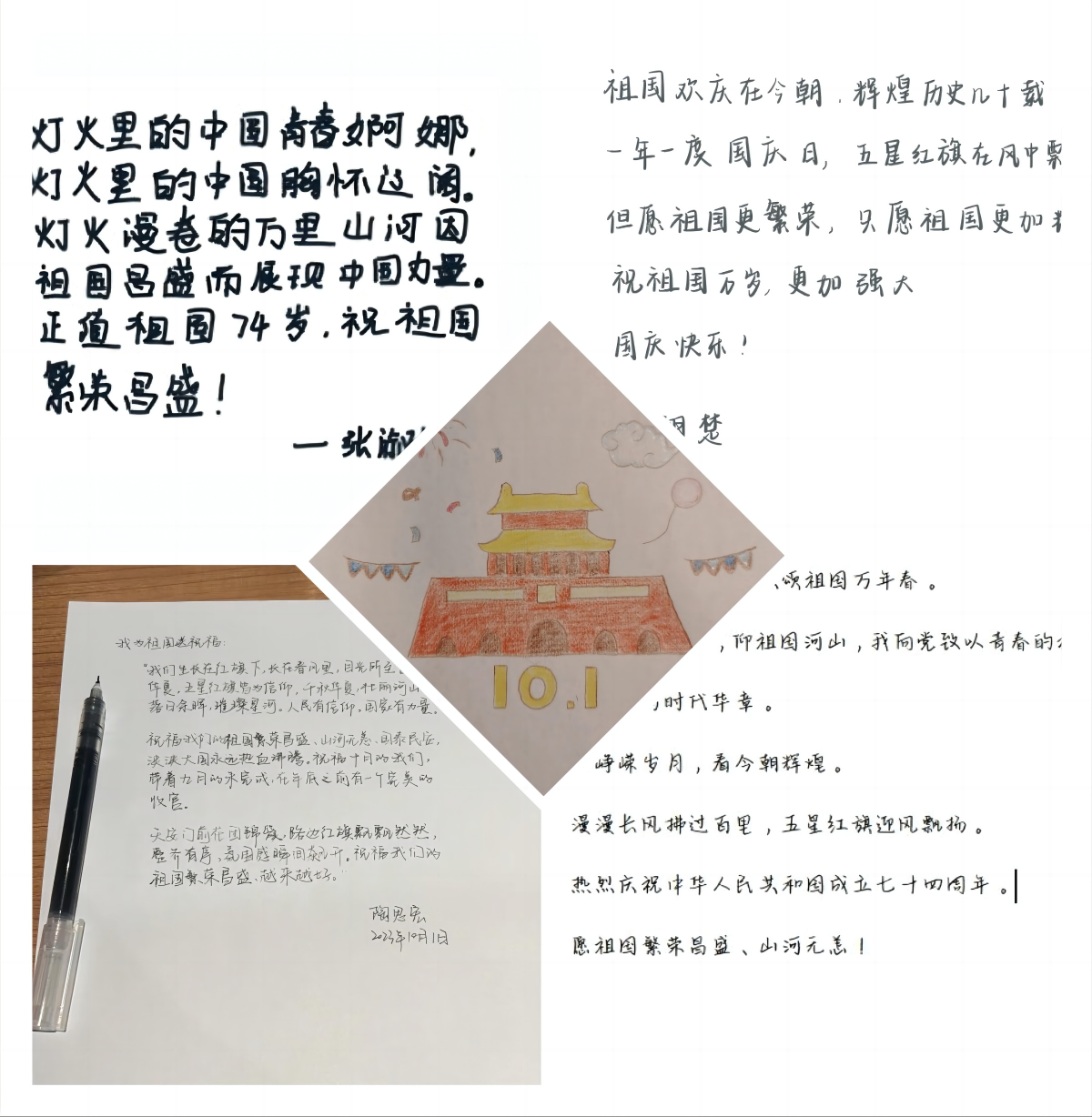以手执笔抒真情,同心同梦贺祖国。党支部成员通过手写祝福语、手绘图画的形式为祖国庆生:“泱泱中华万古江河,如日之升如月耀恒”“祝福祖国繁荣昌盛、山河无恙、国泰民安,泱泱大国永远热血沸腾。祝福十月的我们,带着九月的未完成在年底之前有一个完美的收官。”“欣望江山千里秀,欢颂祖国万年春。回望锦绣画卷,仰祖国河山,我向党致以青春的礼赞吾辈青年更应赓续先辈志,续写时代华章。忆峥嵘岁月,看今朝辉煌。漫漫长风拂过百里,五星红旗迎风飘扬。热烈庆祝中华人民共和国成立七十四周年。愿祖国繁荣昌盛、山河无恙!”……