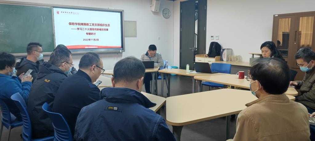 2022年11月2日下午1:30,精算教工党支部在沙河校区公司楼13号楼205召开党员大会,开展“学习党的二十大报告和新党章”专题研讨。支部党员结合个人学习情况,开展了学习交流。