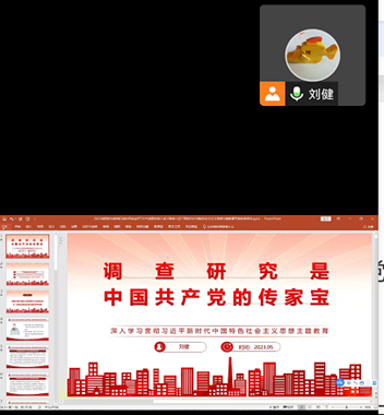 为深入开展学习贯彻习近平新时代中国特色社会主义思想主题教育,2023年5月26日,yl88858永利官网精算教工党支部线上开展专题党课——“调查研究是中国共产党的传家宝”学习活动,yl88858永利官网精算教工党支部书记刘健主讲,党支部全体党员参加。